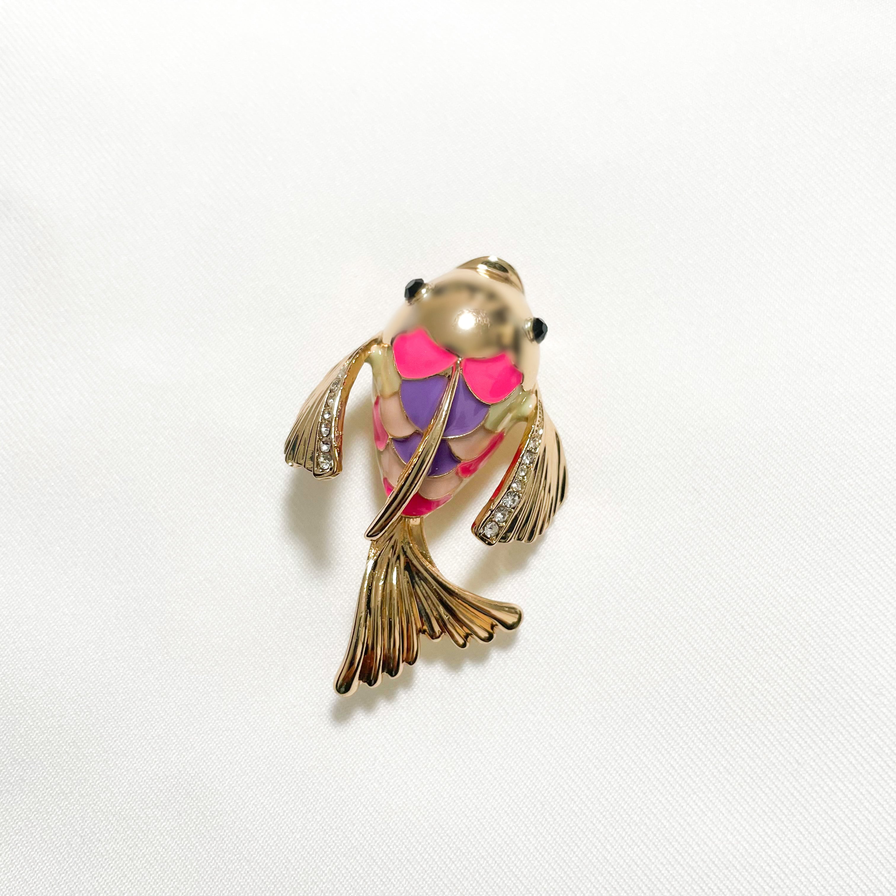 ■鯉がモチーフのブローチです。 □頭部分は鏡面のようになっています。(どうしても撮影時に周囲の景色が反射されてしまったので、写真ではぼかしを入れています) サイズ:3.5*5.5